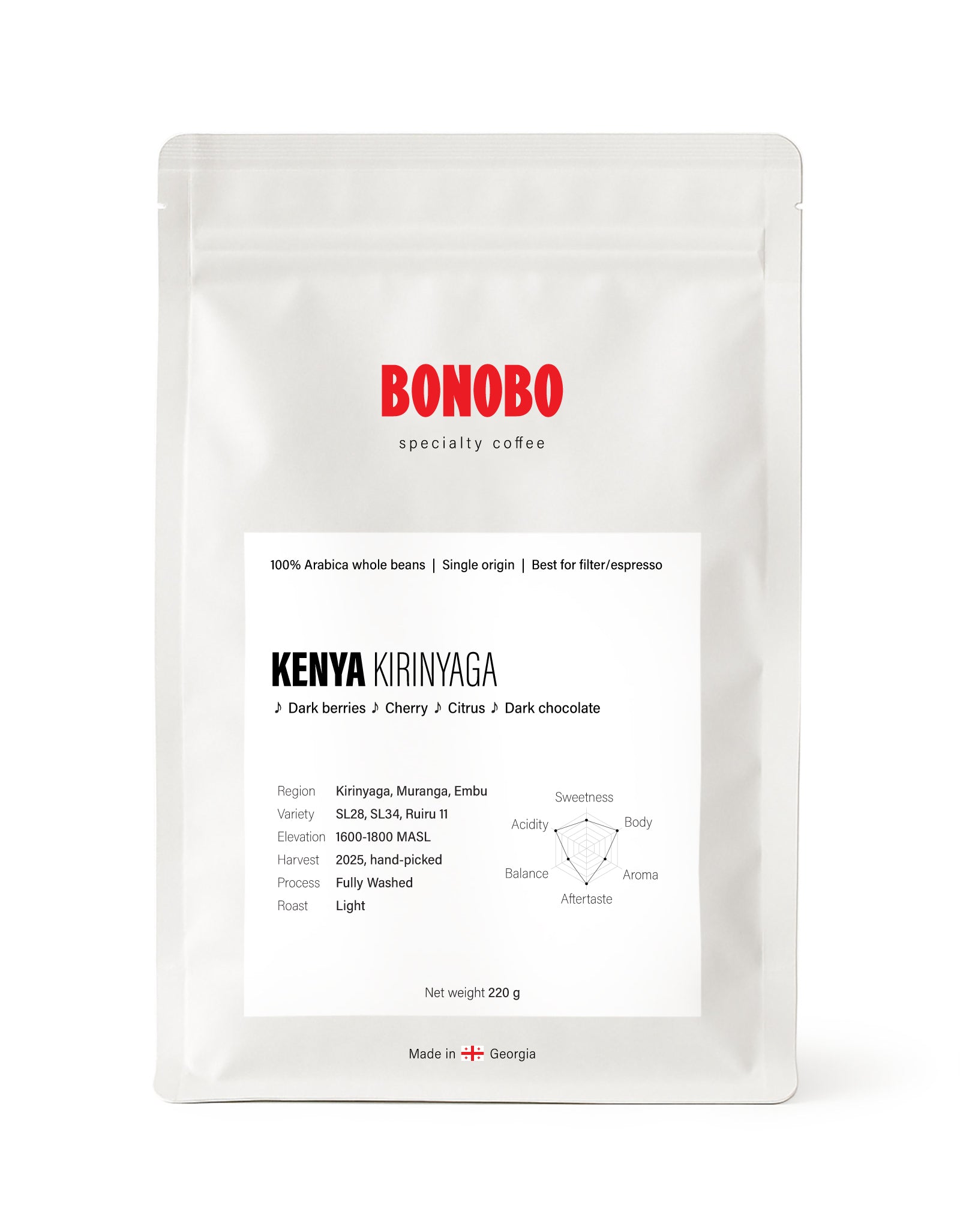 Grown from classic Kenyan varieties SL28, SL34, and Ruiru 11, this coffee delivers clarity, depth, and unmistakable Kirinyaga character.